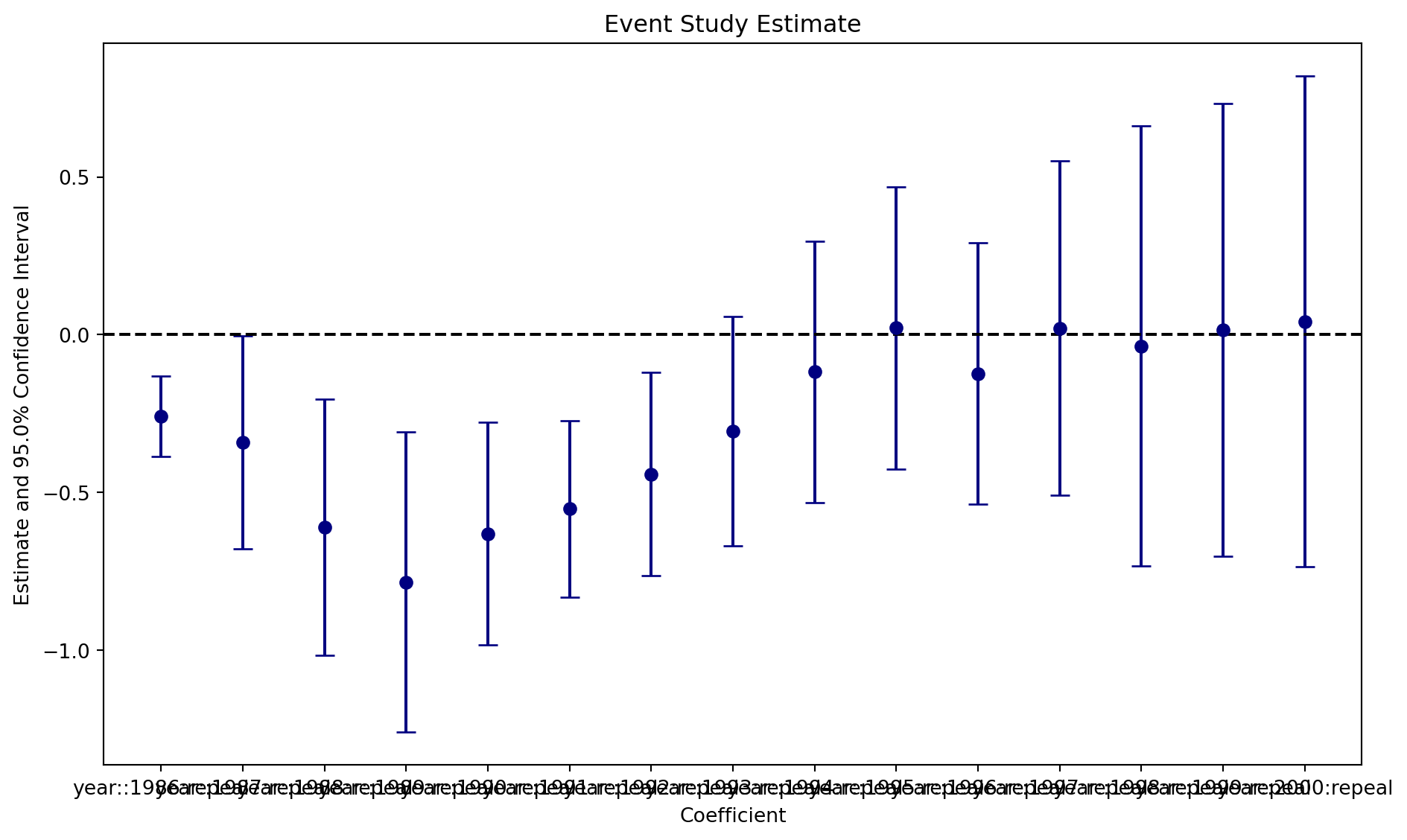 fml = """lnr ~ i(year, repeal, ref = 1985) + C(repeal) + C(year) + C(fip)