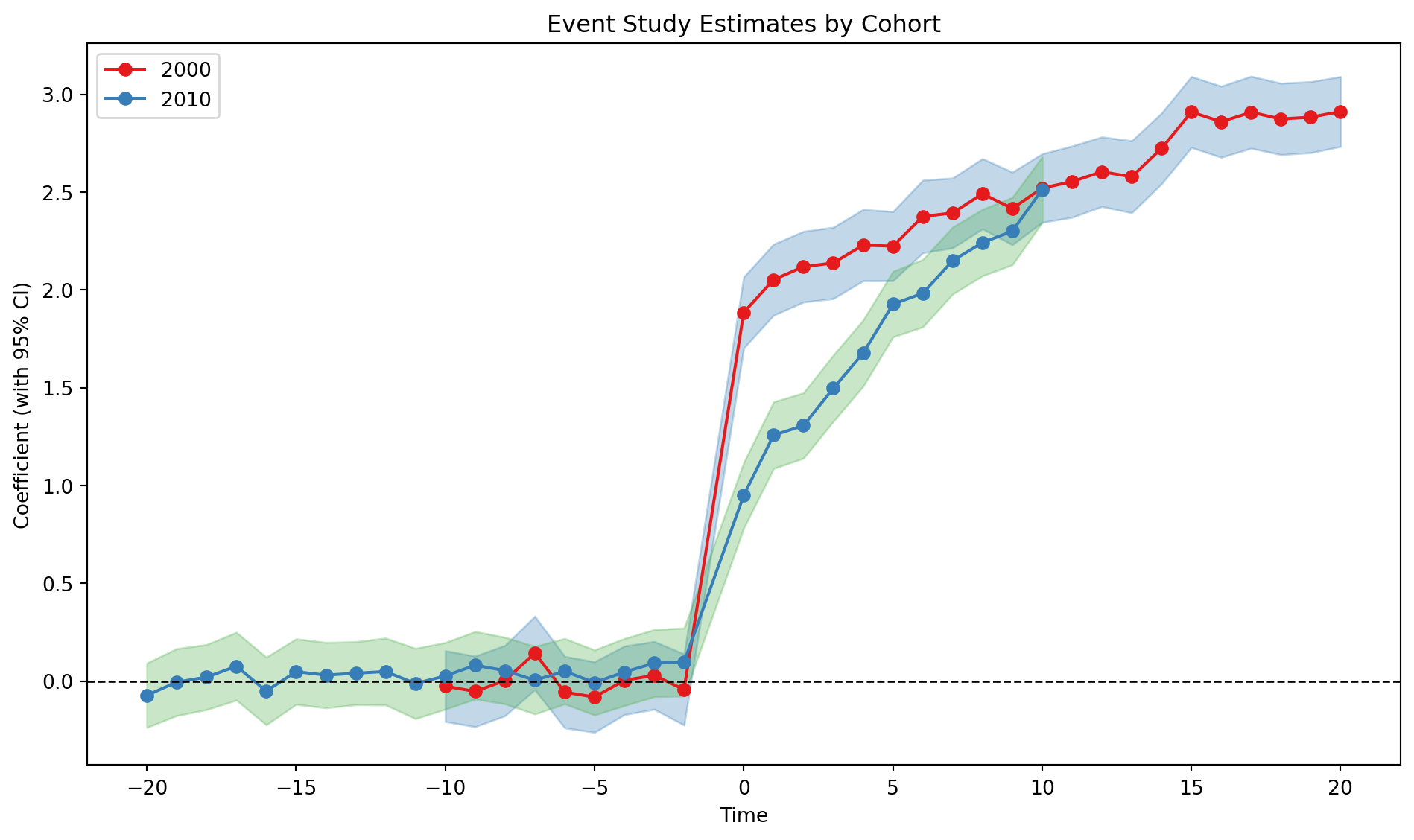 We immediately see that the first cohort is switched into treatment in 2000, while the second cohort is switched into treatment by 2010. Before each cohort is switched into treatment, the trends are parallel.