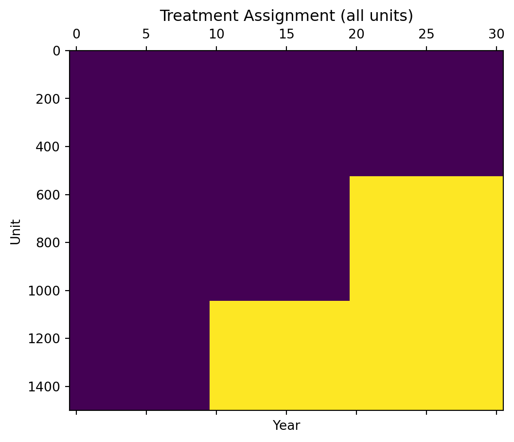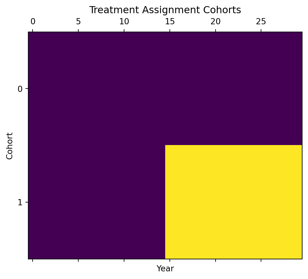 We can also plot treatment assignment in a disaggregated fashion, which gives us a sense of cohort sizes.