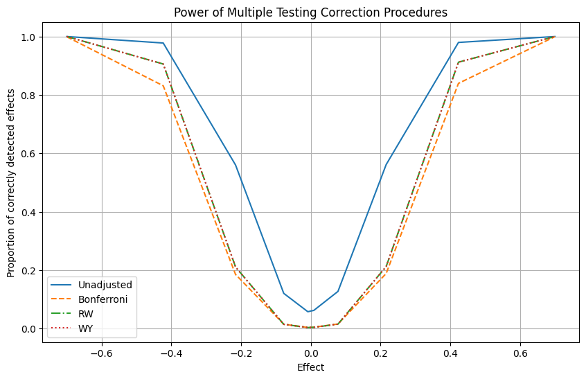 We see that for any simulated effect size, the Romano-Wolf and Westfall-Young methods detect a higher share of true positives than the Bonferroni method: they have higher power.