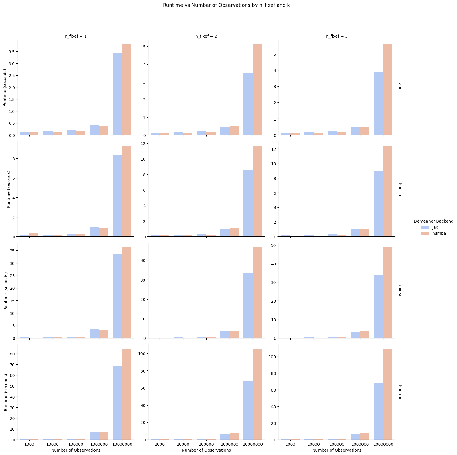 We test two back-ends for the iterative alternating-projections component of the fixed-effects regression on an Nvidia A100 GPU with 40 GB VRAM (a GPU that one typically wouldn’t have installed to play graphics-intensive videogames on consumer hardware). numba benchmarks are run on a 12-core xeon CPU.