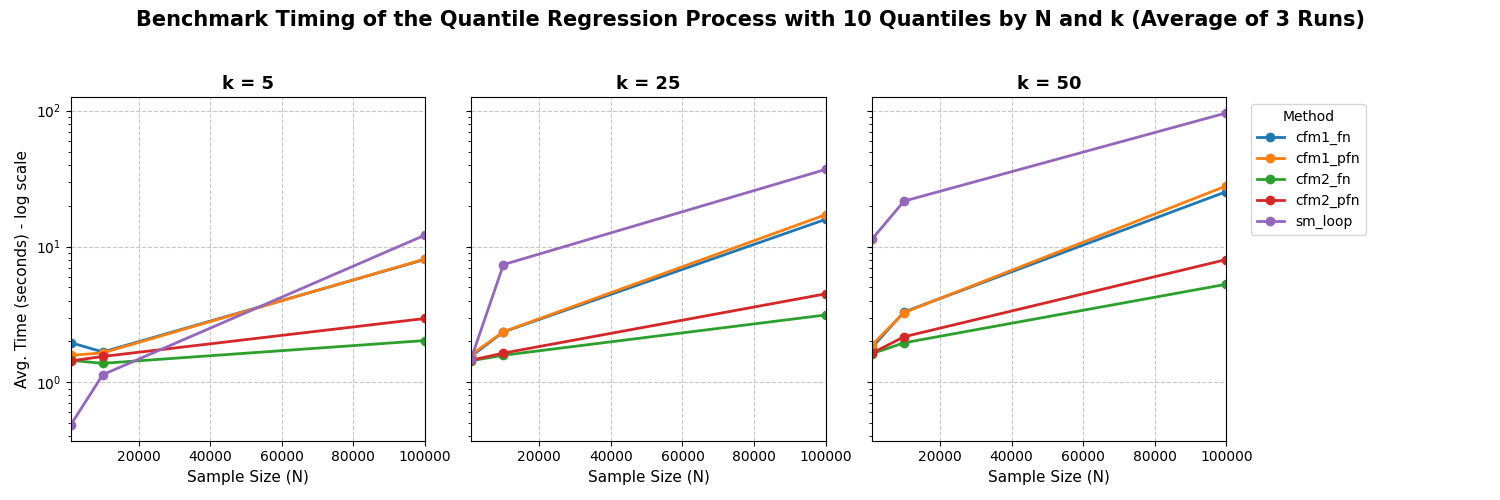 We fit a quantile regression process on \(q = 0.1, 0.2, ..., 0.9\) quantiles and vary sample size and number of covariates. We test pyfixest’s implementation of the quantile regression process against a “naive” for loop implementation via statsmodels. We can see that both multi_method = "cmf1" and multi_method = "cmf2" outperform the for-loop strategy for large problems. Note that the plot is in log-scale!