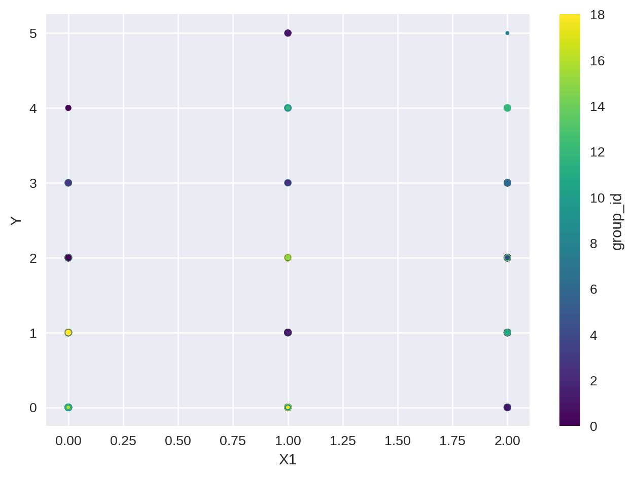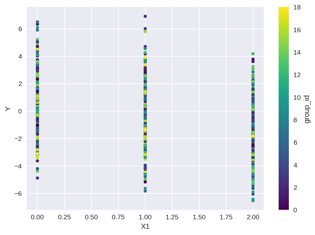 We are interested in the relation between the dependent variable Y and the independent variables X1 using a fixed effect model for group_id. Let’s see how the data looks like: