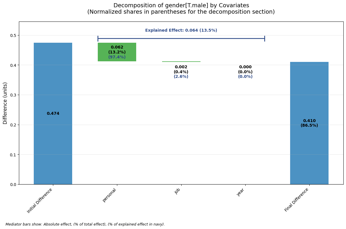After fitting the full model, we can run the decomposition procedure by calling the decompose() method. The only required argument is to specify the focal variable decomp_var, which in this case is “gender”. Inference is conducted via a non-parametric bootstrap and can optionally be turned off.